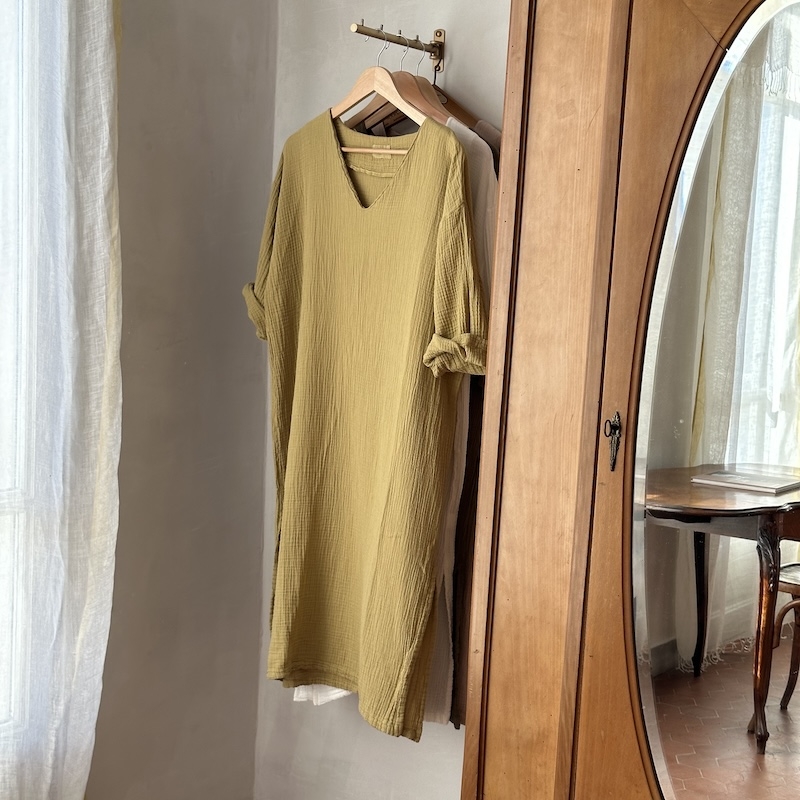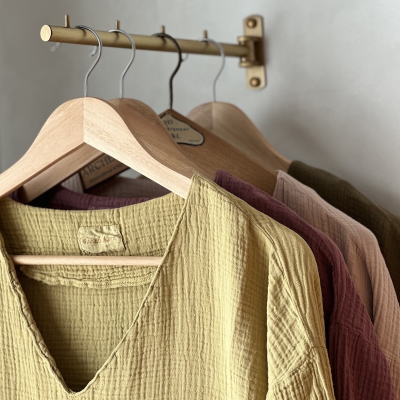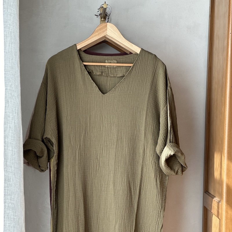 Col V, manches 3/4, fentes latérales, 100% coton écoresponsable, texture gaufrée