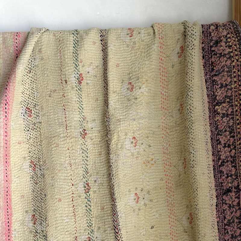Ces kanthas (couvertures conçues artisanalement en Inde) sont des couvertures anciennes réalisées à partir de saris vintage assemblés et rebrodés à la main.