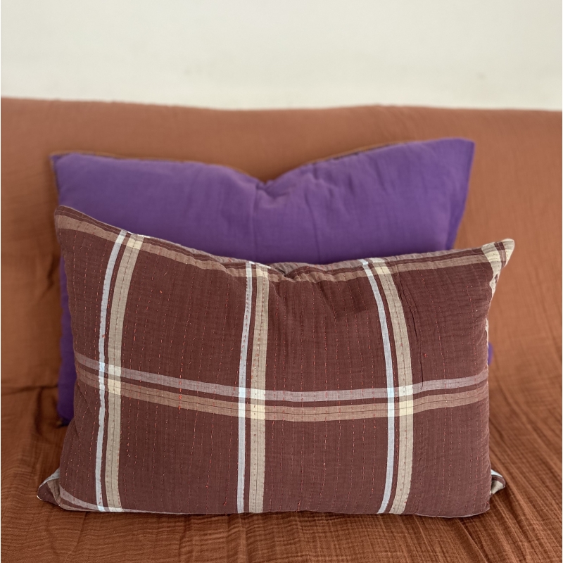 Cette technique ancestrale du "Kantha" permet de donner une seconde vie aux tissus en assemblant plusieurs couches de vêtements usés, en faisant de chaque couverture (recyclée ici en coussins) des pièces uniques, singulières et chamarrées.