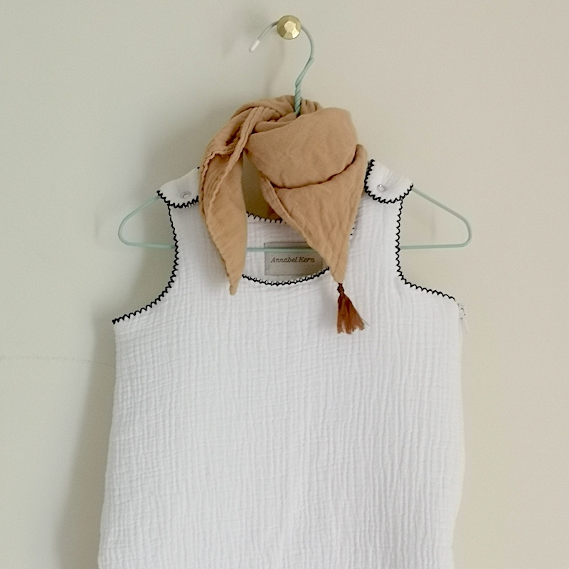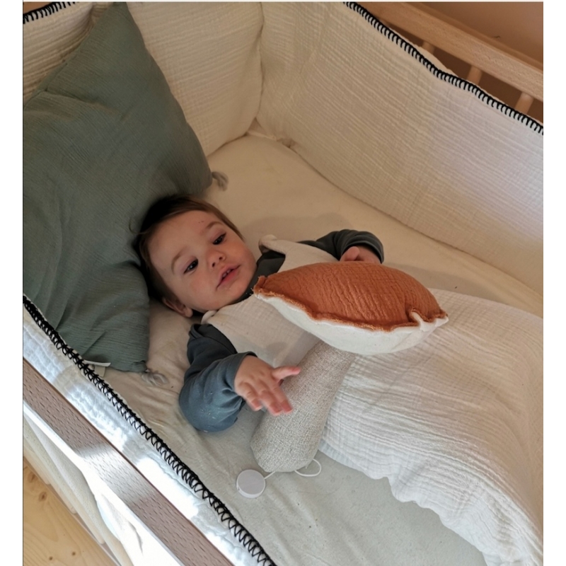 100% double gaze de coton ultra douce, ouatine 100% polyester, fermeture par un zip sur le côté et 2 boutons aux épaules, couture point "picueta" en coton noir à l’encolure pour le détail raffiné