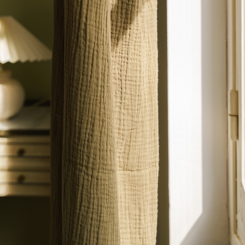 100% double gaze de coton, finition point cheval noir en haut, a ajuster selon la hauteur que vous aimez avec ou sans volant, lavage doux 30°