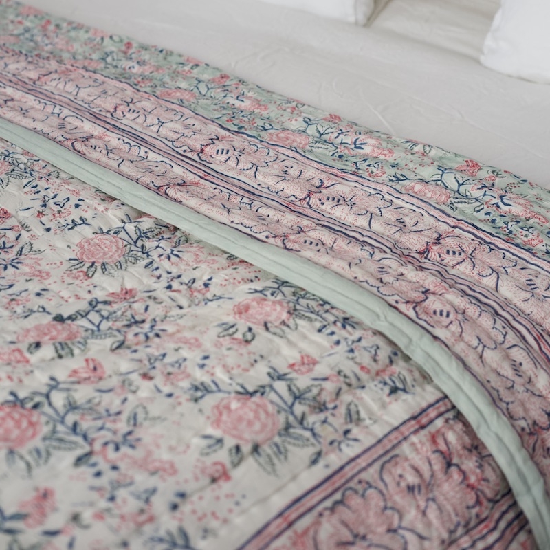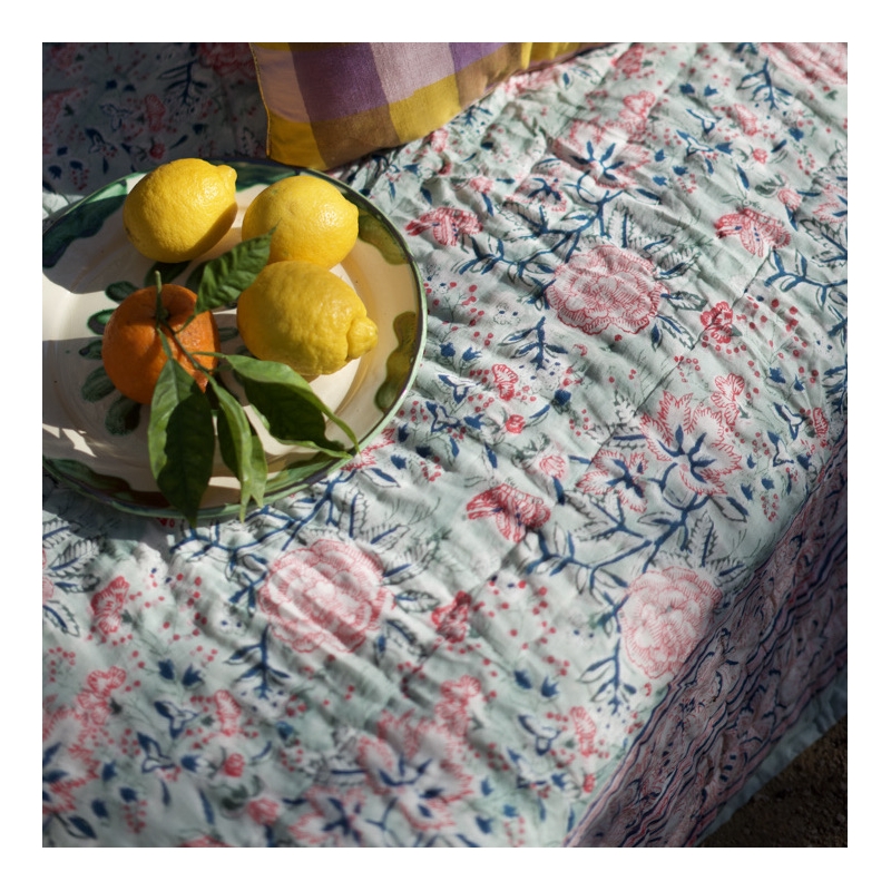 Couverture matelassée et réversible aux teintes pastels de vert amande et rose doux.