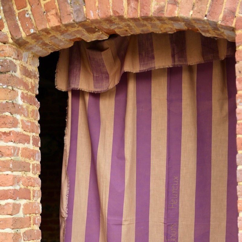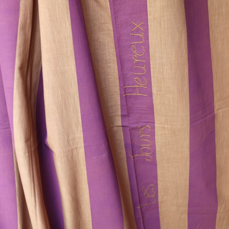 Elégante et chic dans son imprimé à rayures transat et sa broderie centrale, aux teintes chaudes et hivernales.