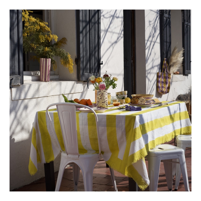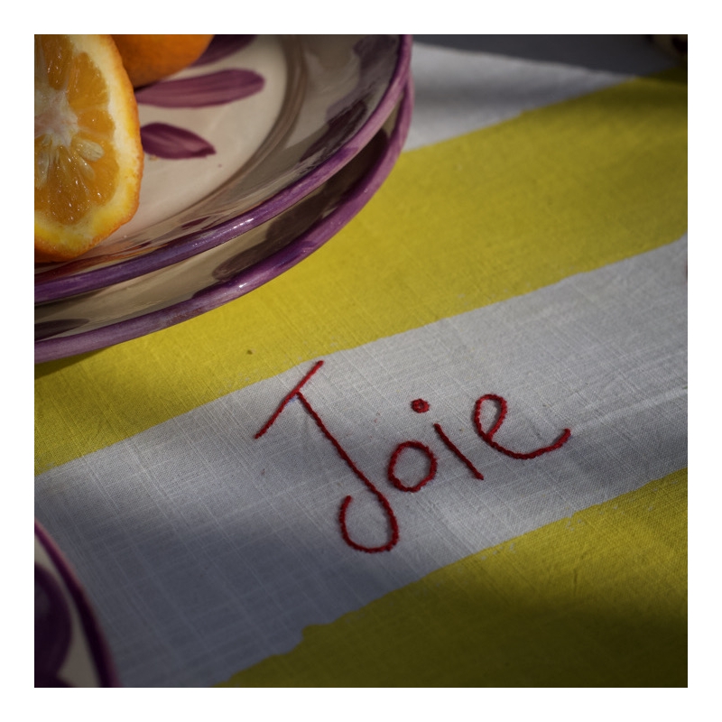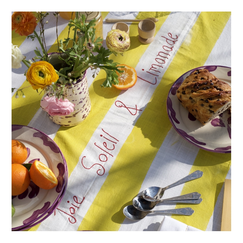 On adore ses rayures transat et son élégante broderie centrale. Une invitation aux belles tablées conviviales